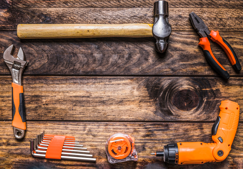 - Wrenches, sockets, pliers, hammers, measuring tapes, levels, and ratchets